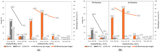 Figure 6 presents the results of the bench-scale flotation tests per mining front. The mass balance of the tests, the overall metallurgical recovery of the Pb and Zn circuit, and the metallurgical recovery per flotation stage were the parameters selected for the comparison and evaluation of the flotation performance of each composite sample.