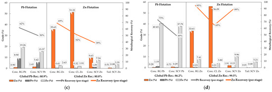 Metallurgical results of the flotation test—composite sample from mining fronts 1 (a), 2 (b), 3 (c), and 4 (d).