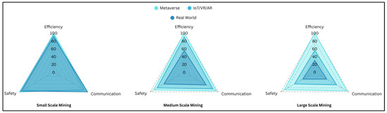 The control variables used to define the preliminary model are efficiency, safety, and communication (Figure 3). The three diagrams represent an equal number of different scales of mining operations (small, medium, large mining). Efficiency, communication and safety are critical to consider when introducing new technologies. Most importantly, the integration must support the production process, enhancing efficiency. Additionally, three key areas must be considered—the real world, the Metaverse, and IoT/VR/AR—each corresponding to the variables at the corners of the diagrams.
