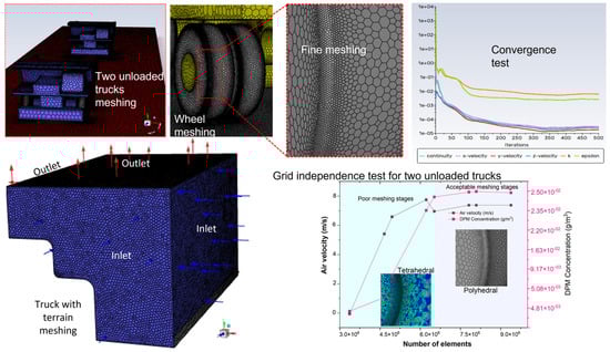 Developing physical models and meshing is crucial in Computational Fluid Dynamics (CFD) for accurate fluid flow Simulations. Our models rely on fluid mechanics and particle motion principles, often based on the Navier-Stokes equations. We used CAD- 2021 and ANSYS SpaceClaim 2023 R1 software to design the geometry, which was imported into ANSYS Fluent for simulation. Accurately representing features such as sharp edges, curves, fluid domains, and internal structures is essential for capturing the flow dynamics. Our physical model divides the geometry into three parts to reflect the transportation scenarios in Ha’erwusu open-pit mines. This scenario involves various transport vehicles moving materials in and out, including simulations of single and double trucks traveling in the same direction and loaded and unloaded trucks moving in opposite directions across single and multiple bench-face terrains on the designated road surface. The CAT777D off-road dump truck, built on a 1:1 scale (Figure 2), has a capacity of 100 t. The simulation examined a car traveling at 10 m/s and a maximum speed of 40 km/h under four wind speeds: 3, 5, 8, and 10 m/s, in both downwind and crosswind scenarios. A grid independence test was conducted by exploring the airflow and concentration of dust in the results of the simulation calculations, by varying the number of elements from 3 million to 9 million. Under the condition that the wind direction is downwind, the speed is 8 m/s, and other conditions are constant. A double-truck scenario was considered, and dust-airflow interaction was evaluated after the trucks had advanced 1 m forward from their initial position, capturing early-stage wake development and turbulent dispersion. Air velocity (m/s) and DPM concentration (kg/m3) were monitored at a fixed point located 2 m directly behind the first truck’s tail, representing the near-wake zone with high turbulent intensity and dust recirculation. As shown in Figure 3, both parameters increased significantly as the mesh was refined from 3 M to 6 M elements. Beyond 6M cells, the change in air velocity and DPM values became minimal (<2%), indicating that mesh convergence was achieved. As shown in Figure 3, the simulation domain was discretized using a structured mesh to ensure accurate and efficient computations. Three Mesh A configurations were selected: Mesh A (2,401,891 nodes) for single-vehicle simulations, Mesh B (6,254,032 nodes) for two unloaded vehicles, and Mesh C (4,807,659 nodes) for loaded vehicles on multiple bench terrains. The mesh quality was optimized using the “Make Polyhedral” command, which improved the orthogonality and smoothness of the mesh. The orthogonal mesh qualities were above 0.32, with an average quality above 0.84, ensuring that mesh distortion did not adversely affect the simulation results.