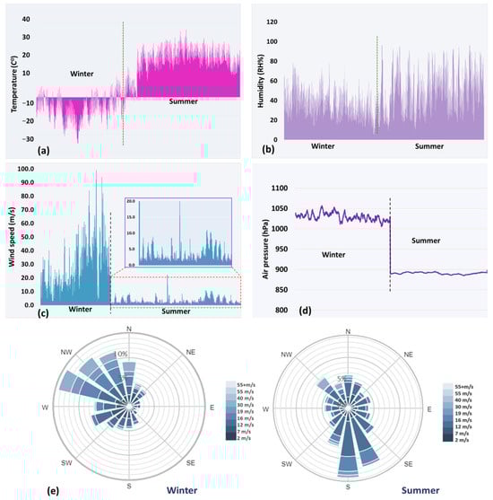 Average seasonal variation of meteorological factors for winter and summer: (a) Temperature, (b) Humidity, (c) Wind speed, (d) Air pressure, and (e) wind direction.