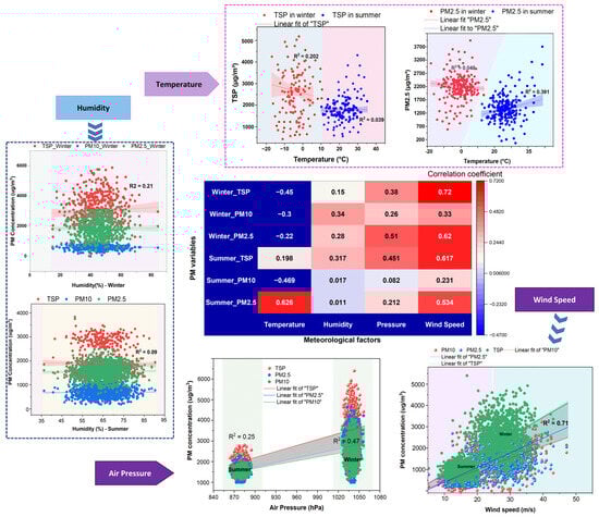 Humidity demonstrated less to moderate positive correlations with PM2.5 and PM10 in both seasons (e.g., PM2.5: r = 0.011 in summer, r = 0.28 in winter), suggesting that humidity contributes to short-term particle agglomeration and surface retention, especially for finer particles. However, during summer, the regression analysis shows that humidity alone explains only a small portion of the variability in PM concentrations, with an R2 of 0.09 for PM2.5, TSP, and PM10. In winter, humidity has a moderate impact on PM concentrations (r = 0.317 for TSP), which can be attributed to the lower moisture levels in the environment and the higher air pressure. Despite this, the positive correlation suggests that humid conditions can slightly reduce the resuspension potential by promoting particle aggregation, thereby lowering airborne dust concentrations. These low correlations indicate that humidity has a minimal influence on dust concentrations during summer, highlighting the minor role of other factors such as temperature and wind speed, which are more dominant in determining dust concentrations.