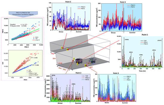 Spatial distribution of dust concentrations at different sampling points from sampling location 1 during winter and summer seasons with the PM2.5 vs. PM10 vs. TSP correlation diagram.