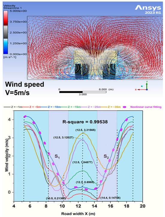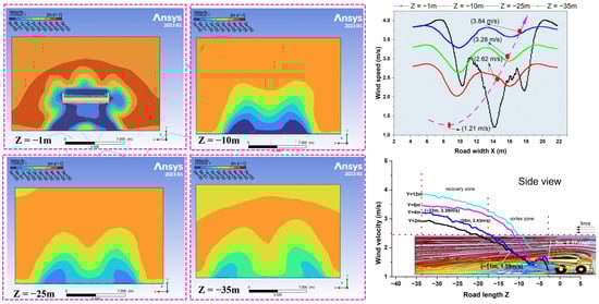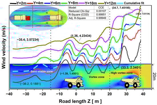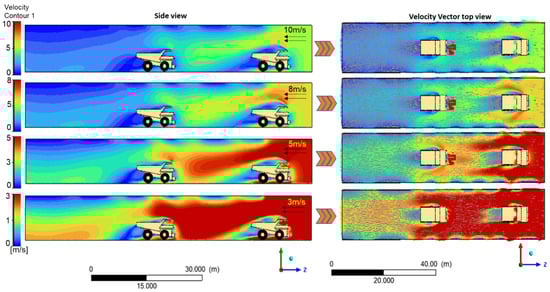 As the lateral coordinate Z transitions from 40 m to −15 m, velocity fluctuations diminish, with the maximum wind speed decreasing from 7.45 m/s to 4.33 m/s at a height of 12 m, closely aligning with the inlet wind speed of 8 m/s. Within the vortex zone, wind velocity increases from 1.45 m/s at Y = 2 m to 4.33 m/s at Y = 12 m, highlighting the influence of closely spaced mining trucks on airflow behavior over lateral distances. The minimum wind velocity, recorded at 3.57 m/s around Z = −35 m at Y = 12 m, marks the semi-stable zone, suggesting a transitional area where dust resuspension may persist unless mitigated. As illustrated in Figure 9, a single mining truck significantly alters airflow direction and wind velocity distribution, as researched by []. Two prominent trailing vortices, S1 and S2, formed behind the truck, with the vortex zone peaking between Z = −1 m and −15 m before diminishing laterally along the central axis. These vortices can trap dust particles and prolong local exposure durations, especially in low wind conditions. The truck speed significantly influences the vortex zone, inducing turbulent airflow and irregular vortex formation. However, the effect gradually weakened between Z = −15 m and Z = −35 m. The vortex morphology and wind distribution patterns around the mining truck, as shown in Figure 10 (back view), are analyzed at a truck speed of 10 m/s and an ambient wind speed of 5 m/s. A significant vortex zone was observed at Z = −1 m behind the truck, with wind speed fluctuations reaching peaks and troughs of approximately 3.05 m/s and 1.21 m/s, respectively. These fluctuations imply that dust particles can experience alternating upward and downward lift forces, complicating containment strategies. Compared with multiple trucks, the vortex zone for a single truck is more localized, implying that traffic density is a critical factor in dust exposure control. Wind speed gradually recovers from 1.21 m/s to 3.81 m/s as the distance from the truck’s tail extends to Z = −35 m, demonstrating airflow stabilization further downstream. This recovery region helps inform the recommended downwind safety buffer for workers or equipment. Figure 10 (back and side views) illustrates contour vortex morphology distribution; airflow rates range from 3.42 m3/s near the truck to 20.34 m3/s at Z = −33 m. This highlights the impact of the vortex zone, where turbulence results in a reduced wind speed. The recovery rate progressively approaches undisturbed conditions: at Z = −3 m, wind velocity is 0.57 m/s, reflecting an 11.40% recovery; this increases to 31.80% at Z = −11 m, 48.60% at Z = −20 m, and 67.80% at Z = −33 m with a wind speed of 3.39 m/s. This analysis emphasizes the spatial extent of truck-induced vortex zones and the downstream distance required for airflow to return to a stable, undisturbed state.