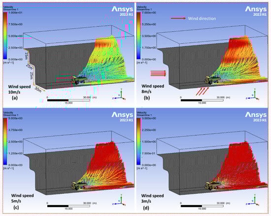 Velocity streamlines on multiple bench faces: (a) v = 10 m/s, (b) v = 8 m/s, (c) v = 5 m/s, and (d) v = 3 m/s with crosswind direction.