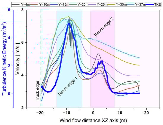 The relationship between wind speed and turbulence kinetic energy (TKE), as illustrated in Figure 12, provides critical insights into airflow dynamics in open-pit mining roads. The results indicate that the wind speed and TKE increase as the airflow moves downstream, demonstrating a gradual recovery and transition toward greater stability under laminar conditions. This trend suggests that, while the initial turbulence is induced by vehicle motion and terrain features, the airflow eventually stabilizes as it moves away from the source of the disturbance. At Y = 15 m, a distinct pattern of localized acceleration and turbulence was observed, which was attributed to the secondary flow interactions. These interactions arise from variations in terrain elevation and vehicle-induced airflow disturbances, leading to a complex airflow behavior that influences dust dispersion. The high TKE values in these regions highlight areas of intensified mixing, which can contribute to prolonged dust suspension and transport over extended distances. These findings underscore the model’s effectiveness in simulating real-world mining conditions and provide a foundation for optimizing dust-mitigation strategies. By understanding the interplay between wind speed, turbulence, and airflow recovery, mining operations can implement targeted control measures such as strategically placed wind barriers, optimized haul road alignments, and adaptive dust suppression techniques.
