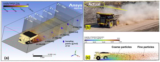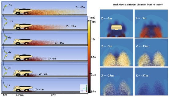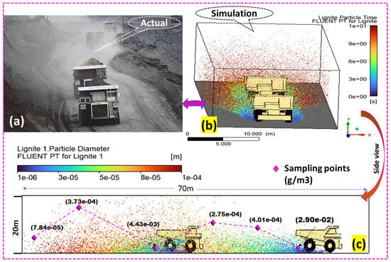 Figure 18a,b, illustrate this effect, where both field observations and simulation results indicate increased dust migration rates and an expanded affected area. Data from random sampling points (Figure 18c) at various heights and distances showed a peak concentration shift from Z = 25 m to Z = −40 m within 15 s. Near the source, dust particles migrate at approximately 2.5 m/s due to intense turbulence in high-vortex zones, but slow to 1.13 m/s beyond Z = −30 m, where turbulence dissipates. The settling velocity (Vs) is crucial for determining the particle deposition rates. On average, Vs ≈ 0.00363 m/s, indicating that finer particles remained suspended for longer periods before settling. Higher dust concentrations, averaging 2.90 × 10−2 g/m3, were recorded near the first truck, gradually decreasing to 7.84 × 10−5 g/m3 as particles dispersed at increasing horizontal and vertical distances, particularly around Y = 4 m, Z = −40 m. These results suggest the compounded effects of multiple trucks on dust transport and highlight the necessity for improved dust control measures. Optimizing truck spacing is essential for mitigating dust accumulation and improving air quality. The study suggests that maintaining a minimum spacing of up to 50 m between trucks moving at 10 m/s under a wind speed of 5 m/s allows sufficient time for dust particles to settle before being disturbed again. During stronger wind conditions (>5 m/s), a gap between trucks of more than 50 m is recommended to prevent excessive downwind dispersion. Road surface conditions play a crucial role in dust suppression. When the haul road is not watered, dust resuspension is significantly higher, requiring truck spacing above 80 m to prevent excessive dust accumulation. In contrast, when the road is watered, moisture helps bind particles, thereby reducing airborne dust. In such cases, if the wind direction is not parallel to the truck route, a shorter spacing may be feasible without significantly increasing dust dispersion. Additionally, traffic scheduling strategies, such as staggered truck movements or designated waiting intervals, could reduce dust buildup along haul roads, thereby minimizing their impact on surrounding areas.