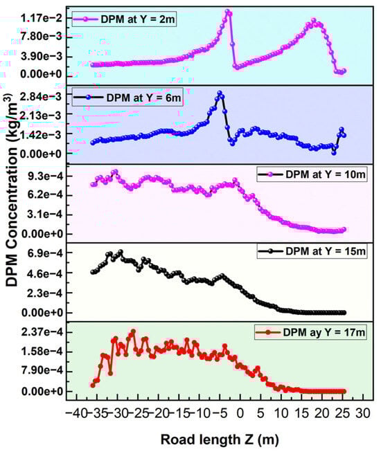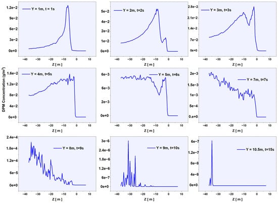 As shown in Figure 17, the migration rate of airborne dust can be assessed by tracking the displacement of a dust plume over time. Peak concentrations occur at approximately 1.3 × 10−2 g/m3 at Y = 2 m, Z = 25 m, near the tail of the first truck, before decreasing to 2.85 × 10−3 g/m3 at Z = 0 m. The concentrations rose again to 1.17 × 10−2 g/m3 before eventually dropping to 3.5 × 10−5 g/m3 at Z = −40 m, indicating particle settling due to gravitational forces and reduced turbulence. At Y = 17 m, the dust concentration decreased from 2.37 × 10−4 to 2.39 × 10−5 g/m3, suggesting minimal accumulation at higher altitudes. This pattern resembles real-world mining conditions, where fine dust particles disperse over long distances, significantly affecting air quality.
