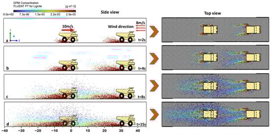 Side view and top view of dust concentration at time variation (a) t = 2 s, (b) t = 4 s, (c) t = 8 s, and (d) t = 15 s during multiple trucks’ movement.