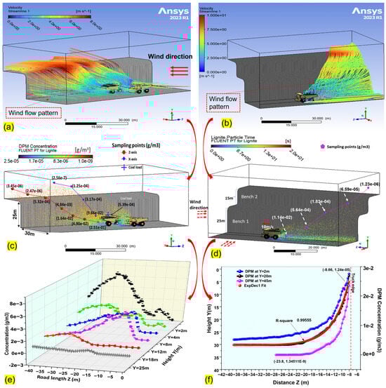 Influence of wind flow, terrain configuration, and truck operation on dust dispersion and DPM concentration trends along the z-axis. (a) Wind streamlines over a single-bench terrain. (b) Wind flow over multi-bench terrain. (c) Simulated DPM concentration pattern and sampling points along x- and z-axes. (d) Particle residence time across multiple benches (e) DPM concentration profiles at varying horizontal and vertical dispersion. (f) DPM concentration decreasing with distance increase from its source.