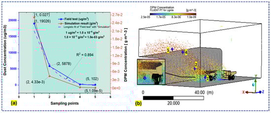 (a) Comparison between simulated and field-measured dust concentrations over distance at specific monitoring points, and (b) random sampling of the spatial distribution and concentration of lignite dust particles.