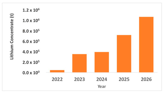 Lithium mining companies in Brazil produce mineral concentrates of spodumene from lithium-rich pegmatites. There are three main companies that operate in the state of Minas Gerais—MG [14] (Figure 1). The country produced approximately 414,000 tons of lithium mineral concentrate at an average grade of 5.5% Li2O in 2023 [15], which corresponds to 22,770 t.