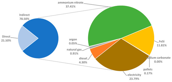 Indeed, the significant contribution of ammonium nitrate-based explosives to global warming is also observed in other studies that report the production of explosives as a major source of CO2eq emissions in the background [54]. GHG emissions from ammonium nitrate are responsible for more than 90% of the contribution to global warming in the production of explosives. This is primarily due to the use of ammonia and nitric acid [55]. More efficient production is crucial to reduce this contribution [56]. One example is ammonium nitrate produced from ammonia made with green hydrogen (obtained by the electrolysis of water), which is a low-carbon process [57,58].