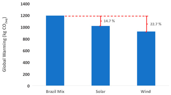 A sensitivity analysis of CO2eq emissions was carried out regarding the types of power sources of the product system. Three generation scenarios were taken into account. A baseline scenario using the current power mix of the country and two alternative scenarios, with 100% wind or solar (photovoltaic) generation, both selected from the Ecoinvent database, considering the Brazilian geographical coverage.