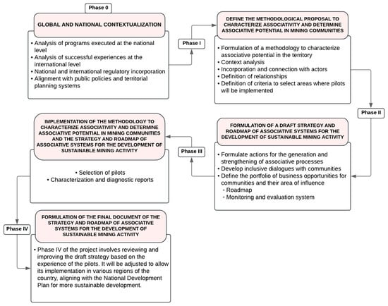 The first phase involves establishing the initial conditions of mining communities and their associative potential. A methodology is implemented to characterize the associative potential by analyzing aspects such as the potential of mining production units (UPMs), territorial governance, and the organizational performance of existing associative structures (see