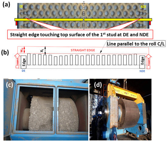 (a,b) Position of the straight edge on the tire surface; (c,d) roller before and after replacement (DE: drive end; NDE: non-drive end).