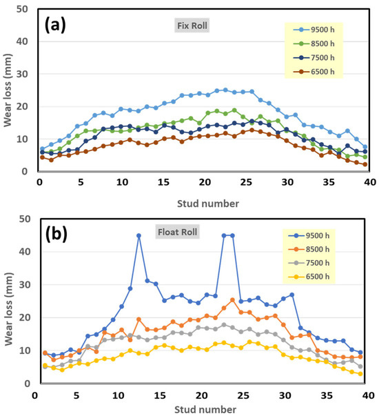 Wear curve of (a) roll-fix studs and (b) float roll HPGR120MI01 at operating hours of 6500, 7500, 8500, and 9500.