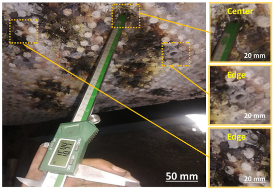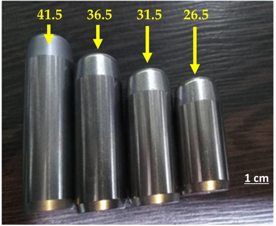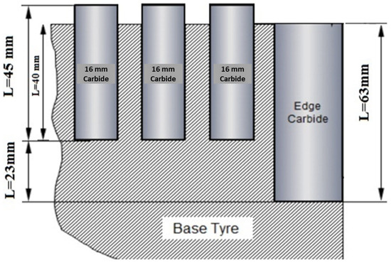 The conducted analyses indicate that the wear and corrosion of the studs range from 5.0 to 13.6 mm at the edges of the roll and from 11.0 to 30.0 mm at its center in the measured section. The minimum remaining depth suitable for installing a replacement stud after 9500 h of operation is 15 mm at the center of the roll (Figure 2). It is important to note that each stud has a diameter of 16 mm and a height of 45 mm, of which 5 mm protrudes above the tire surface, while the remaining 40 mm is embedded within the tire (Figure 3 and Figure 4).