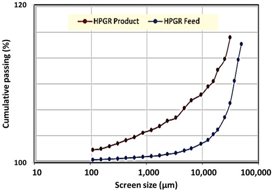 - As shown in Figure 5, the actual feed material entering the HPGR has a particle size distribution of D80 = 45 mm and D100 = 70 mm.