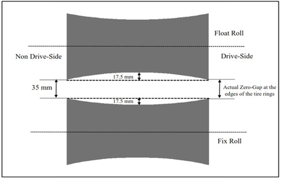 Investigations revealed that no gap adjustments were made during operation, despite roll wear and changes in feed size distribution. As a result, the zero gap increased from 35 mm to 70 mm (Figure 8) without any adjustment to the shim plates. In other words, the zero gap exceeded the required working gap of 55 mm.
