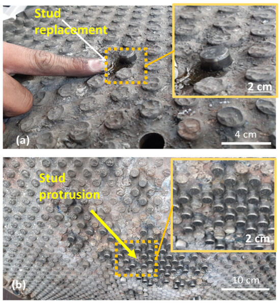Stud fractures occur when iron fragments or foreign objects larger than the zero gap enter the space between the rolls. Additionally, some studs completely detach due to excessive tire wear, making the tire more vulnerable to damage. In cases of stud fracture or detachment, immediate replacement is necessary to prevent the failure of adjacent studs. However, the height of replacement studs is not always uniform (Figure 9). As the tire shell thickness decreases, shorter studs are selected to minimize height differentials, which could otherwise lead to increased localized wear or stud failure (Figure 10). Investigations indicate that there has been no systematic inspection program for monitoring the tire surface and stud condition, resulting in prolonged replacement intervals.