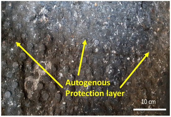 Due to increased wear on the tire surface, elevated vibration levels, and frequent unplanned stoppages resulting from non-compliance with the aforementioned operational parameters, welding and refilling the tire surface were implemented as a temporary corrective measure by the operator. This practice continued until the roll was replaced at 10,256 operating hours (see Figure 16).