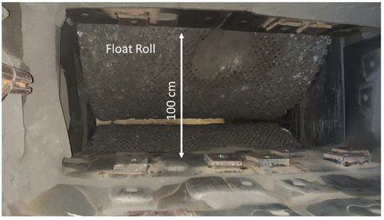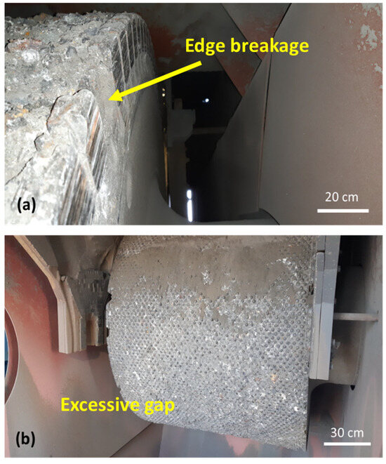 Given the surface deterioration observed in certain sections of the tire after processing 4.8 million tons of iron ore lumps (Figure 5), along with the evaluation of roll surface wear over specified time intervals, the additional monitoring of key parameters influencing roll wear was conducted. These parameters encompass the physical and chemical properties of the feed material as well as the machine settings, as detailed below.