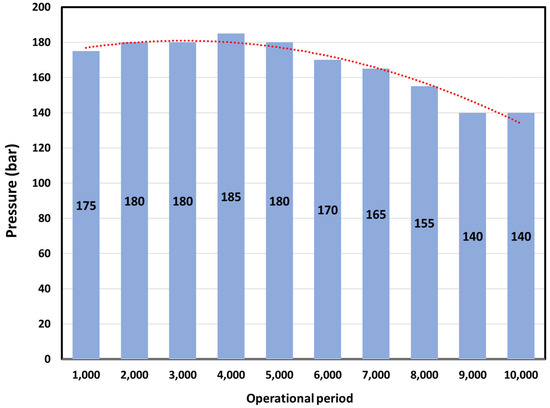 The proportional valve’s initial pressurization setpoint during pre-startup is configured at 80 bars. When the hydraulic system’s DS and NDS pressure gauges indicate 80 bars, material feeding begins. As the slide gate opens and material enters, the system automatically increases the proportional valve’s setpoint from 80 to 130 bar. According to operational records, at the beginning of the commissioning phase, the system pressure was set between 180 and 185 bar to achieve the desired product particle size. Over time, as roll wear increased, operators reduced the pressure. Between 8000 and 10,000 operating hours, the average working pressure used was around 145 bar (Figure 15).