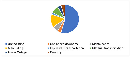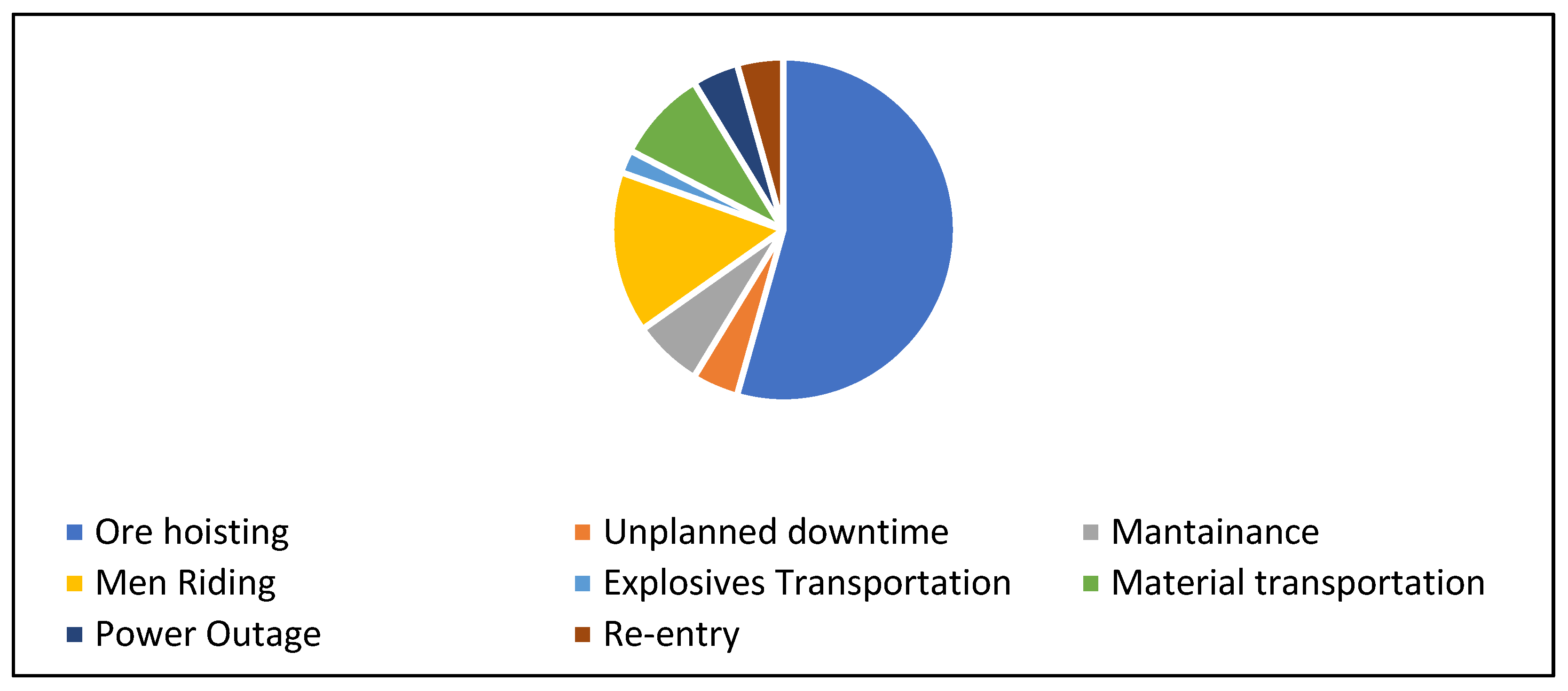 Figure 2 illustrates the daily utilization of the mine’s hoisting system. The planned effective ore hoisting time is set at 12 h. Additionally, specific time allocations are made for various activities: 2.5 h for personnel transportation, 2 h for material transportation, 1 h daily for breakdown allowance, 1 h daily for power outage allowance, 2 h for hoisting station re-entry, 0.5 h for explosives transportation, and 1.5 h for scheduled maintenance.