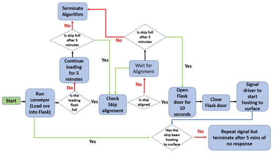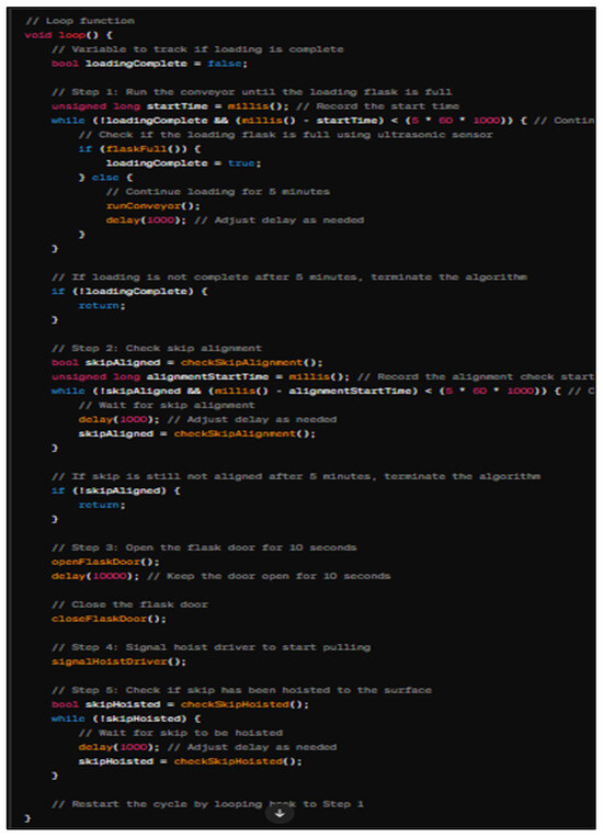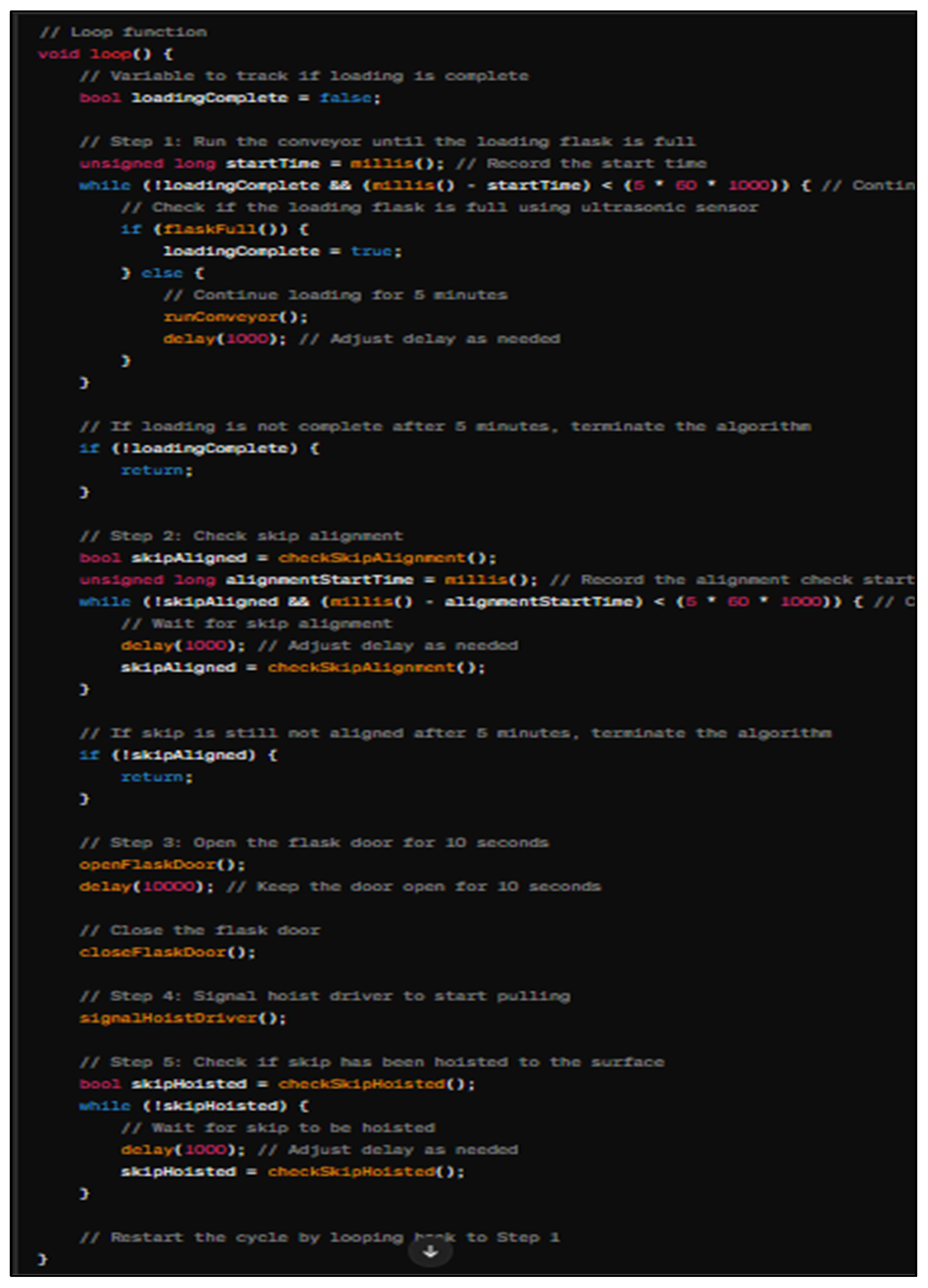 The controller was programmed using the C++ programming language. The algorithm executes the following processes: ore handling and loading flask control, skip loading and positioning, conveyor and flask door control, ore loading and hoisting initiation, hoisting and unloading, skip lowering for repositioning, and iteration until no more ore is detected. The control algorithm follows the sequence outlined in the flowchart presented in