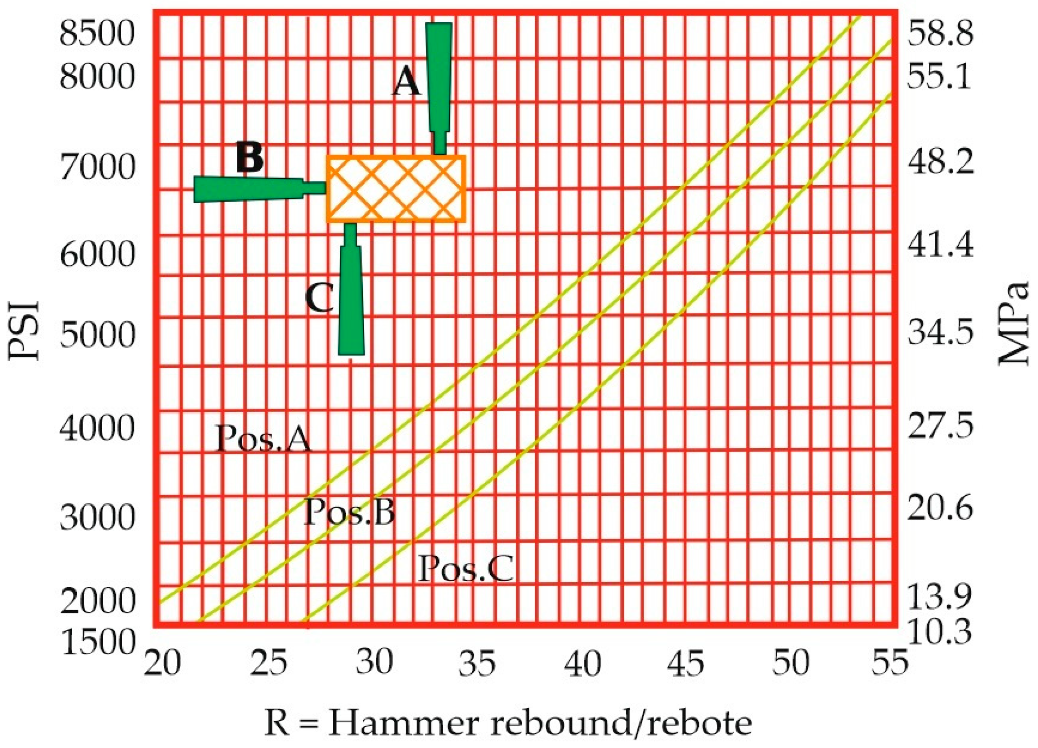 23] of the SH is based on the absorption of part of the spring-released energy through plastic deformation of the rock surface, while the remaining elastic energy causes the actual rebound of the hammer. The distance traveled by the mass, expressed as a percentage of the initial extension of the spring, is called the rebound number. The test makes it possible to estimate the compressive strength of a material by measuring the energy absorption from the impact energy delivered by the hammer. The energy absorption depends on the strength and stiffness of the material. From the impact and using the rebound number, the compressive strength of the material can be estimated using a correlation curve (