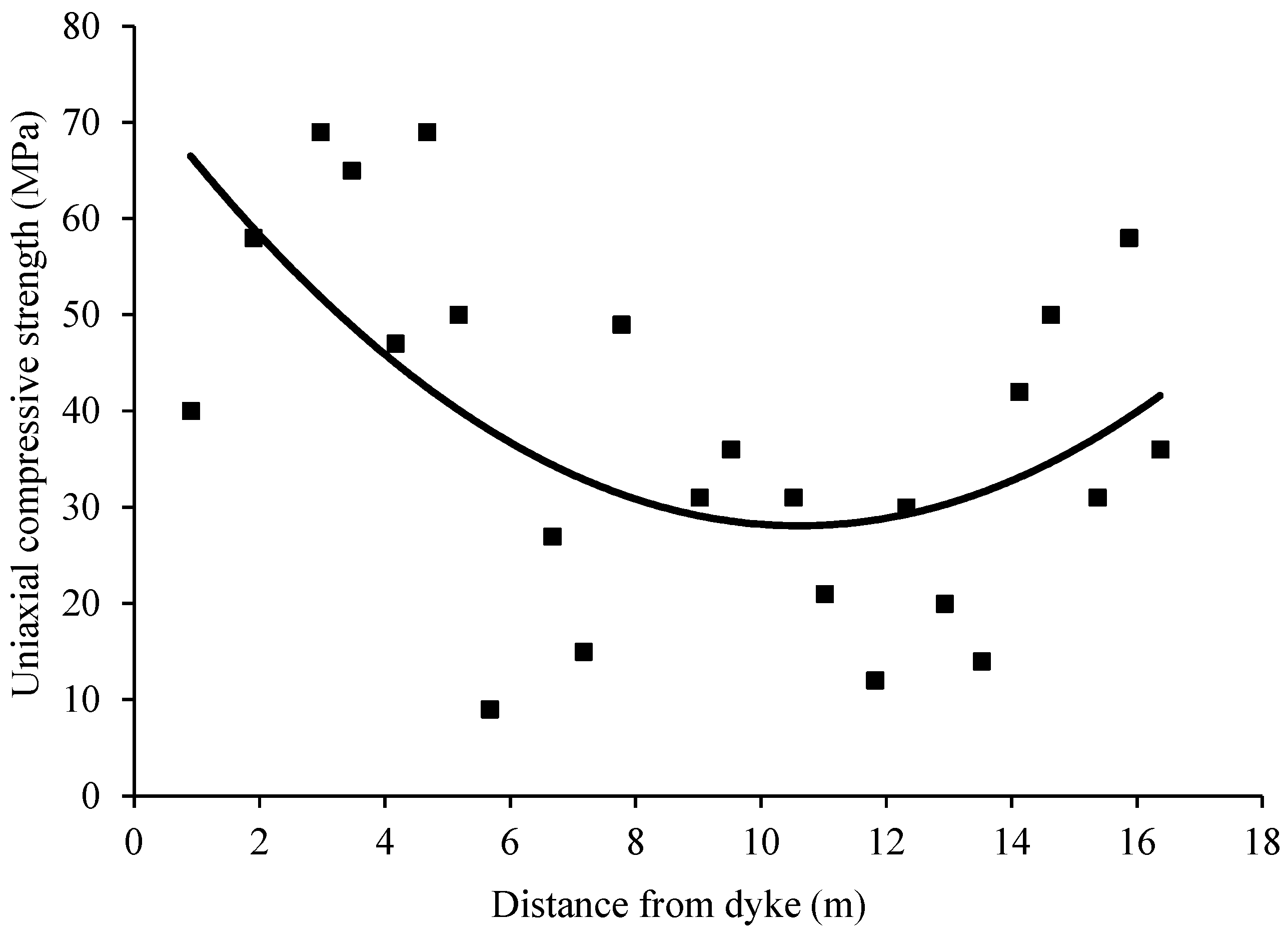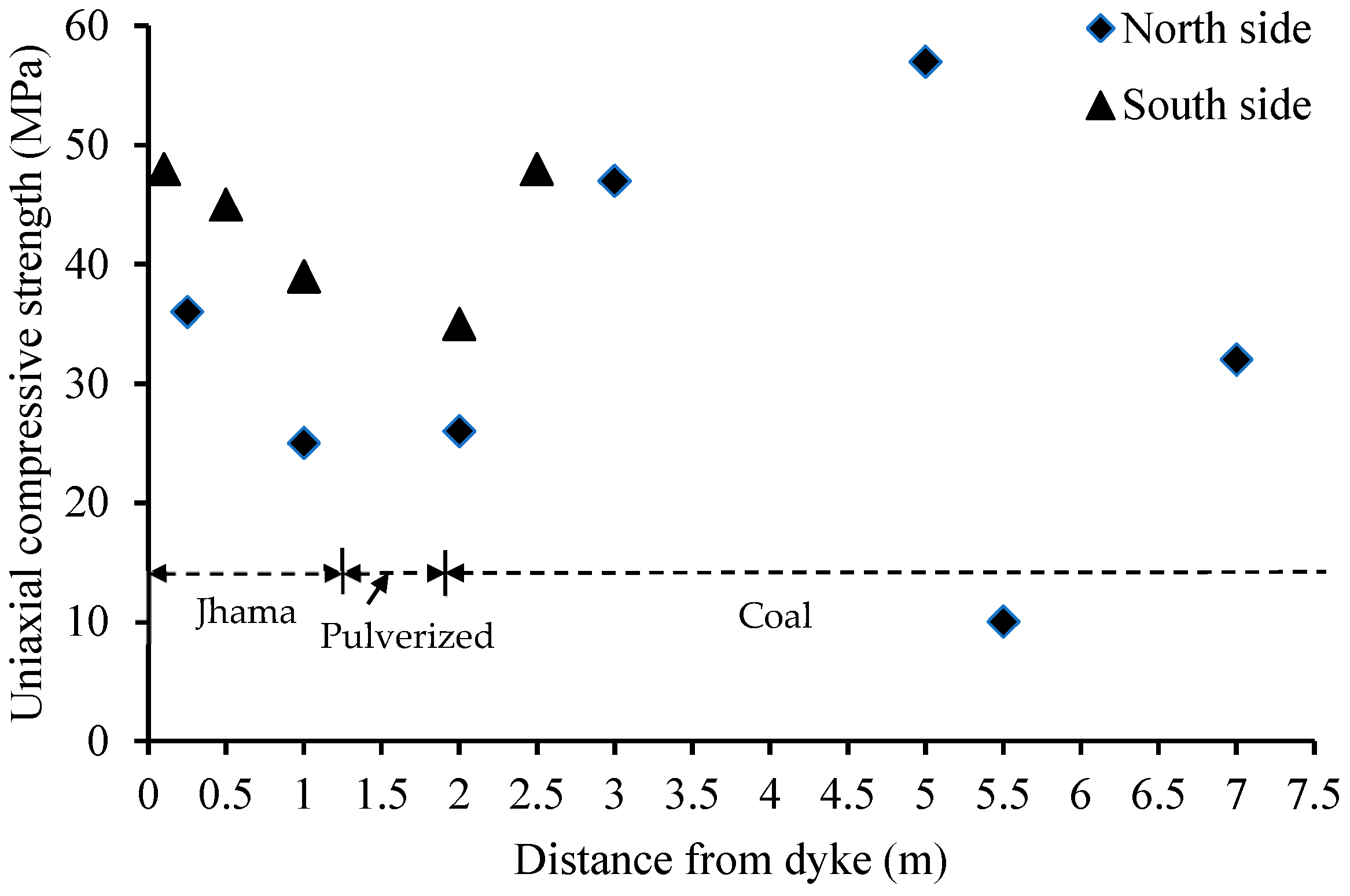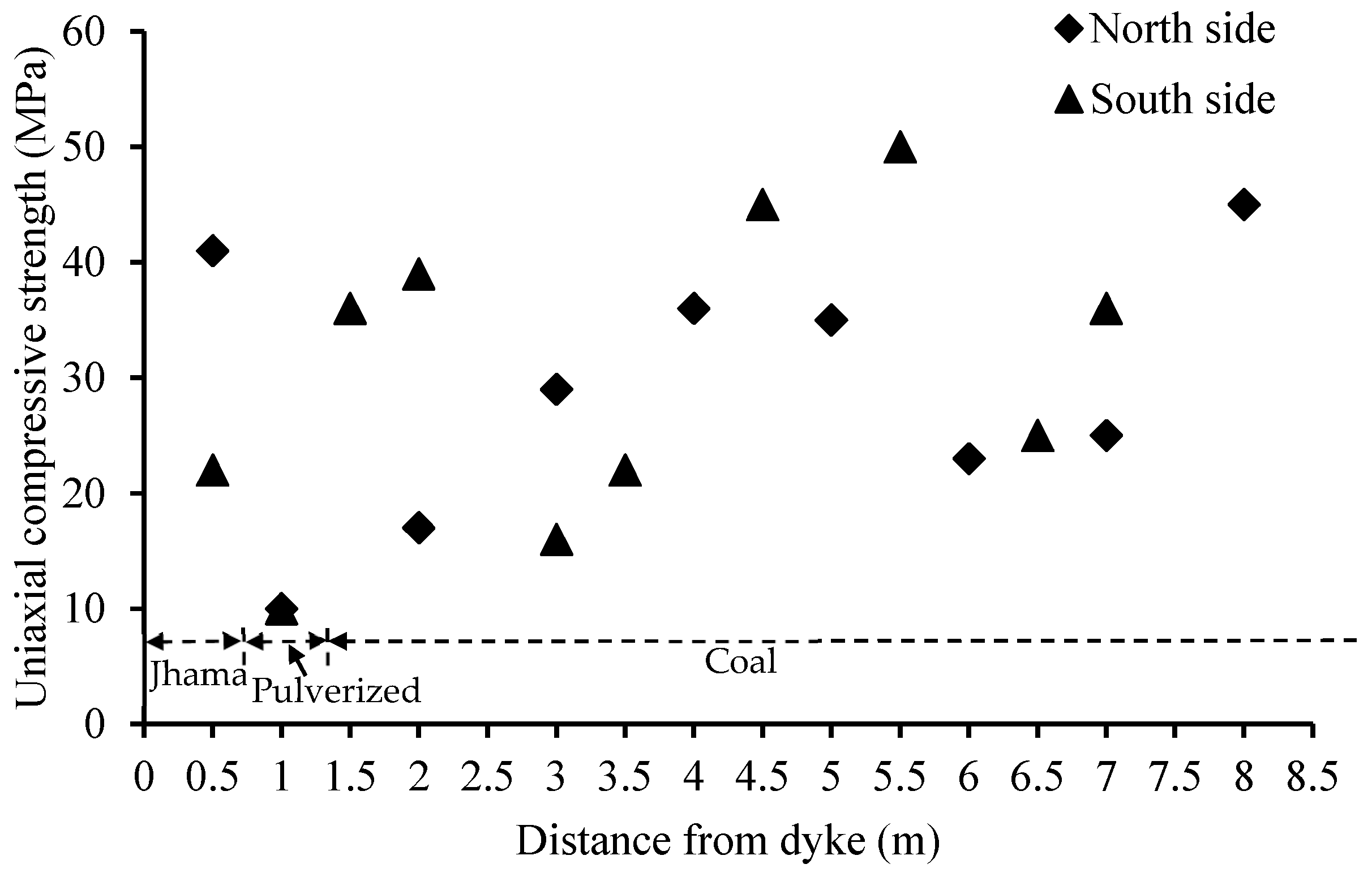 Figure 3. The average values of UCS observed in the jhama, pulverized, and coal zones were 45.2 MPa, 20.8 MPa, and 38.5 MPa, respectively. An attempt was made to develop a relationship (Equation (1)) between UCS in the jhama zone and the distance from the edge of the dyke. The purpose of
