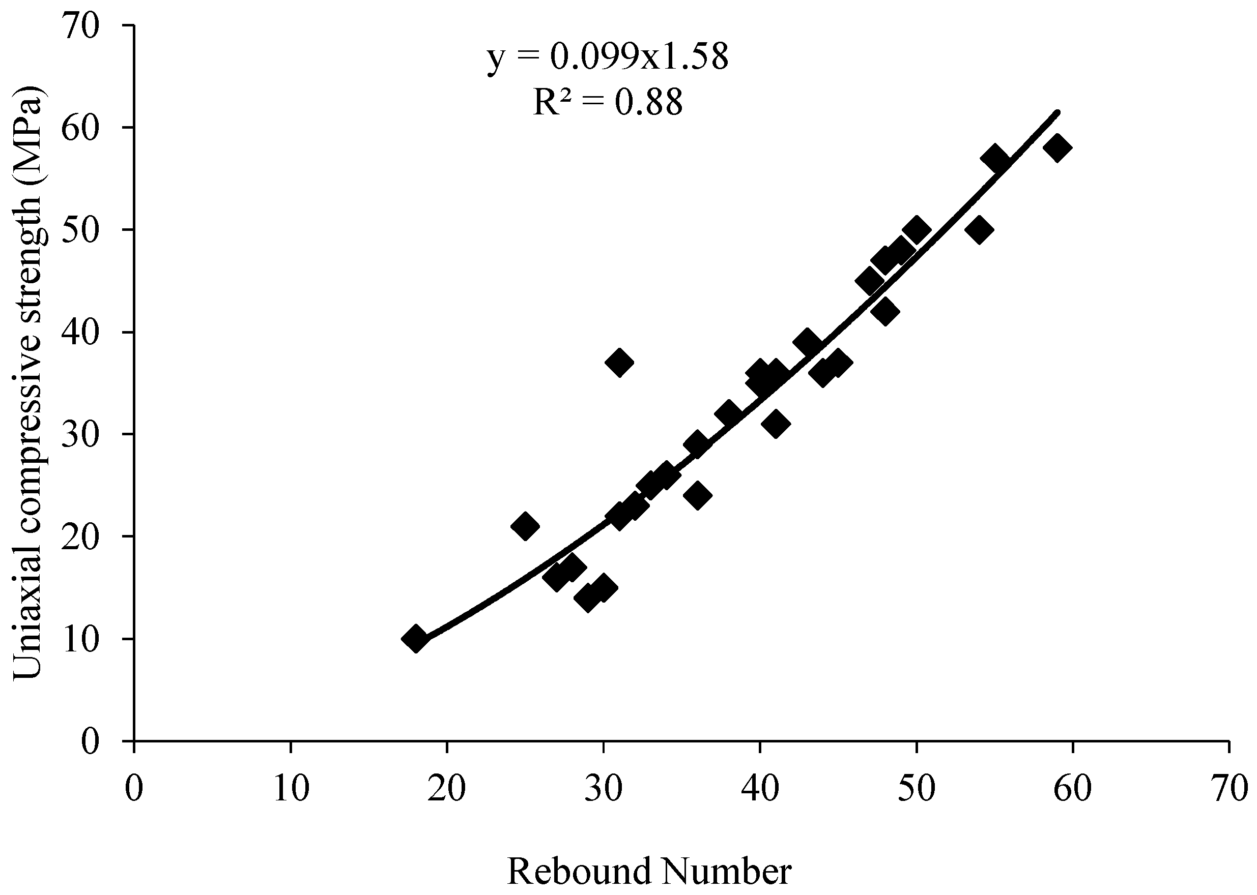Figure 4 between the observed rebound number and UCS for the considered zones aligns well with the correlation curve provided in the Schmidt Hammer manual. Furthermore, the relationship shown in