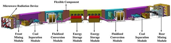 The conventional design may be improved by installing microwave radiation at the cutter head (see Figure 1) to improve rock fragmentation, as reported by []. Worm-like designs may also be considered, along with separate functional features to cater to tunnelling and mining seam needs. The overall setup must also be fitted with gas extraction and transportation systems to prevent potential gas explosions and coal gas outbursts. The extracted gas may be sent to an underground gas power generation facility, thereby increasing the overall efficiency of the operation. Theoretical calculations and studies demonstrate the ability of fluidised mining methods to significantly lower production costs up to 4.8 times compared to conventional mining operations. Moreover, the numerical analysis and evaluations conducted by Ju et al. reported that greenhouse gases and damage to the geological formations can be dramatically minimised through the fluidised mining approach [].