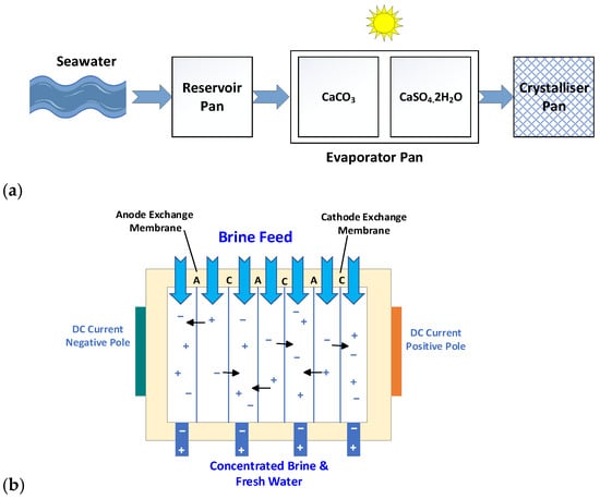The solar evaporation method withdraws brine from the sea and utilises solar energy to induce water evaporation, leaving behind a concentrated salt solution (Figure 3a). This process involves a reservoir tank connected to evaporator ponds, with the concentrated liquor fed to a crystallising pan for salt extraction. Thermodynamically, the precipitation hierarchy follows the order CaCO3, CaSO4, and NaCl. Despite its simplicity, the method offers operational advantages, such as low maintenance and the incorporation of renewable energy, but requires large land masses for optimal evaporation. Potential drawbacks include time consumption and risks of ground contamination without appropriate bunds. Improvements include conductive pans for heat transfer, heat insulation with black paint, and utilising wind energy to accelerate evaporation kinetics, thus reducing land requirements [,]. ED extraction (Figure 3b) involves using an induced electric field to separate minerals through anion and cation-selective membranes. This method is favoured for producing high-purity products with a simple pre-concentration step and generating pure water from brine. This method minimises fouling layer formation and chemical usage but requires rigorous pretreatment to prevent membrane scaling. Commercially explored in desalination and brine treatment, ED has potential applications, such as lithium extraction from seawater. Combining Reverse Electrodialysis (RED) with ED can reduce overall energy consumption by generating electrical power [].