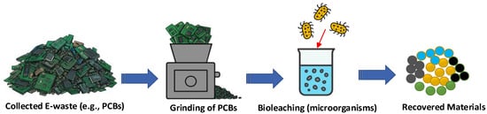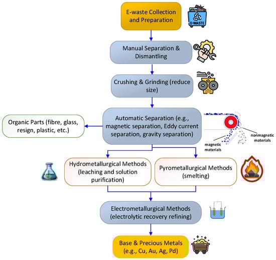 Urban mining is defined as the process of recovering components and elements from anthropogenic materials, which can be sourced from demolished buildings, industrial products, emissions, or even end-of-life vehicles and electronics []. Electronic waste (E-waste) is generally regarded as a source of precious metals, and 95% of the feedstock generated is reported to be recyclable. Micro-integrated circuits, especially their plaques, can contain up to 7% (w/w) iron, 5% (w/w) aluminium, 20% (w/w) copper, 20 ppm gold, and 280 ppm silver []. Electronics formed by Economic Value Added (EVA) elements contain high levels of rare earth elements (REEs), including gold, silver, and copper. Other minerals, such as yttrium, europium, cerium, and lanthanum, are also present in fluorescent, LED, plasma and CRT displays. These sources contain valuable plastics, such as polyethylene, polypropylene, epoxy and polyesters, which may be integrated with fibre-reinforced plastics to produce a cheaper product with extended mechanical abilities. The extraction of minerals from e-waste has been found to consume only 10–15% of the energy required for traditional gold mining. 150 g of gold can be extracted from one ton of micro-integrated circuits, which is significantly higher compared to the extraction capacity of 30 g per ton of ore in conventional mining []. Urban mining is already extensively practiced in several countries, such as China, Chile, Spain, and Australia and contributes up to 20% and 3% of the world’s copper and gold reserves, respectively. During urban mining (Figure 4), the collected e-waste first undergoes physical separation where mechanical methods are used to disassemble the parts and separate them into various categories (e.g., plastics, steel, aluminium, copper and printed circuit boards, Printed Circuit Boards (PCBs)). This step is generally conducted manually via commonly available tools such as hammers and screwdrivers. However, advanced tools such as crushers and grinders may also be used, followed by the application of a density separation technique. Even though the latter method enables production at a higher efficiency, it also incurs higher capital costs. Following its segregation, the e-waste can be treated through one of the following pathways: pyrometallurgical, hydrometallurgical, or bio-hydrometallurgical processes [].