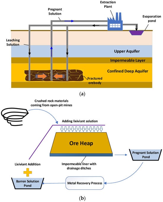 Other potential alternatives to conventional mining methods are In-Situ Leaching (ISL) (Figure 6a) and Heap Leaching (HL) (Figure 6b) techniques, which can produce high-quality metals from low-grade ores. Commercial applications of the in-situ mining method have demonstrated its ability to extract REE, such as uranium, from roll front sandstone deposits, with recoveries up to 70–90%, as well as evaporites, such as soda ash, potash and other salts. According to the study conducted by [], copper recoveries of up to 70% have been estimated when utilising a mix of sulphuric acid and ferric acid sulphate solutions as the principal lixiviants. ISL has been established in several existing USA-based mines, including San Manuel, Santa Cruz, and Mineral Park, which can produce up to 2000 tonnes of uranium per year, along with other minerals such as scandium, rhenium, yttrium, and selenium []. ISL projects offer various benefits, including the elimination of large open pits, exhaust pollution, rock dumps, and tailings, as well as the production of smaller volumes of mining effluents, making them a popular alternative to traditional mining methods. Likewise, HL also began its use in the mid-20th century within the USA, where it was employed to recover rare earth metals using cyanide as the main leaching agent. Further technological advancement also extended its application in the USA, such as the Bluebird copper oxide mine and the Cortex heap leach, for copper and gold extraction, respectively. Each of these establishments reports high recovery rates. Uranium recovery via heap leaching methods has also been explored with significant success in other countries such as Chile. Heap leaching technology can also take higher-grade ores as potential feedstock in remote and politically high-risk locations, as the process incurs low capital costs while maintaining high recovery rates [].