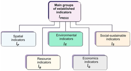 Spatial, resource-related, environmental, economic, and socio-sustainable sustainability call for the development of new models to effectively manage mineral resources in a sustainable way. This is especially relevant today, as the increasing influence of the global economy affects all stakeholders in society. The mining sector in particular has an unprecedented opportunity to mobilise social, physical, technological, and financial resources in support of the Sustainable Development Goals []. In practical terms, indicators serve as essential methodological tools to explore, analyse, and assess the impacts and relationships among different phenomena They help to simplify the complexity of spatial and sustainability issues into a manageable number of relevant variables. Therefore, within the concept of sustainable development, indicators (measurable values) track the changes and the achievement of goals from all sectoral policies and strategies, providing qualitative and quantitative information in a simple and clear way. Črnjar & Črnjar [] emphasised the necessity for indicators to be specific, measurable, usable, flexible, accessible, and cost-effective. During the selection of sustainability indicators, particular attention is given to the characteristics embodied within their respective sub-indicators. With these principles in mind, our study adopts a holistic approach by analysing the influence of all indicators that directly or indirectly affect sustainable mineral resource management, with a focus on the specific territorial context Consequently, five key sustainability indicators were selected: spatial, resource-related, environmental, economic, and socio-sustainable, collectively referred to as (IPREGS) (Figure 1).