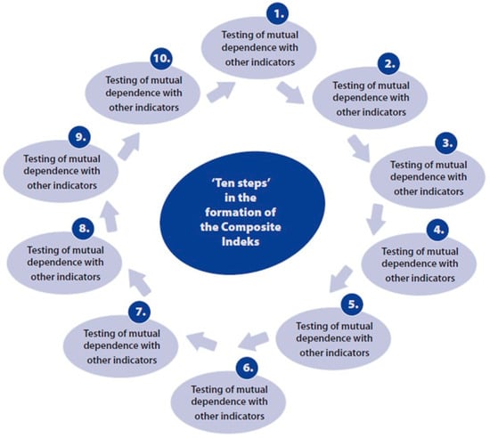In constructing the aggregated composite index in our research, the aim was to derive a single number (AKI) from a large number of input data (sub-indicators) divided into several groups (key indicators) that consistently and reliably represent and express the overall variability of the input data. Therefore, it is of utmost importance to communicate all the steps leading to the creation of the aggregated composite index with experts who will use such an index in order to eliminate potential sources of uncertainty. In developing the aggregated composite index in this research, the Methodology for Developing Composite Indicators [] was consulted as the primary source of information (Figure 2).
