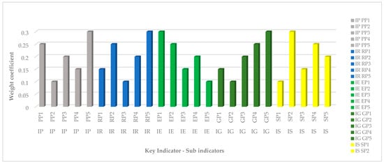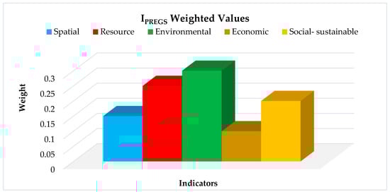 Table 1 shows the weighting factors assigned to the five key sustainability indicators within the IPREGS framework. For clarity, these values are also presented in Figure 3 as a bar chart. The graphical representation illustrates the relative importance of each indicator in shaping the composite index and complements the tabular presentation. Both formats enable a clear comparison of the contribution of each sustainability dimension to the overall framework.