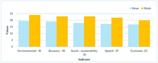 Based on the data from the Questionnaire completed by all stakeholders for the selected five key indicators (spatial, resource-based, environmental, economic, socio-sustainable), five additional sub-indicators were ranked and selected for each indicator, totalling 25. The selection was based on the dominant level of factors and the assigned percentage share resulting from the survey processing) (Table 2) [].