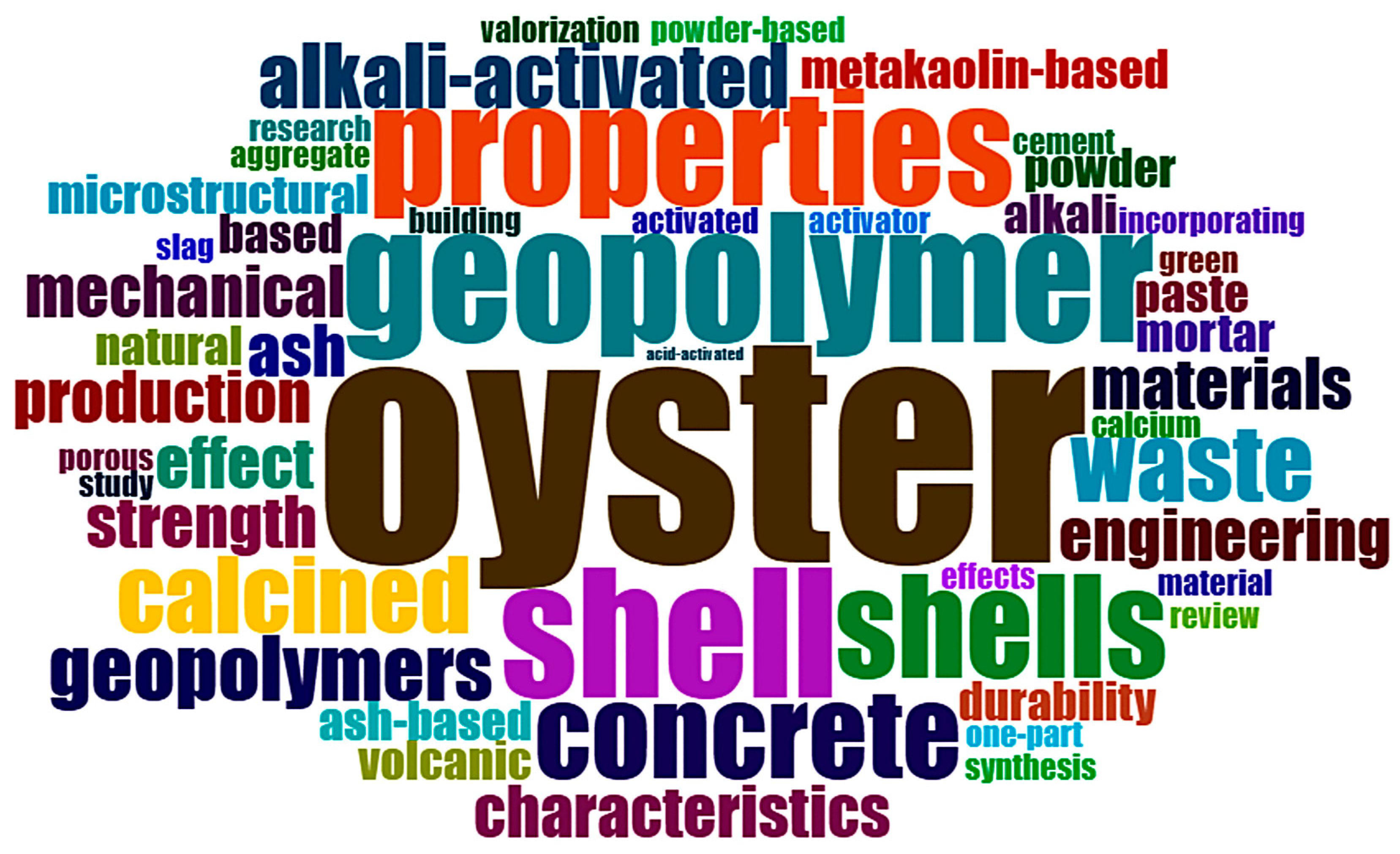 | Oysters | Volcanic ash and bauxite | Solid NaOH and distilled water at 12 M, mixed with sodium silicate (62.4% H2O, 28.7% SiO2, 8.9% Na2O), SiO2/Na2O ratio = 1.45 M | XRF; XRD; FT-IR; UCS; Durability tests, setting time, porosity, and linear shrinkage on specimens | - | ≈28–39 | [47] |