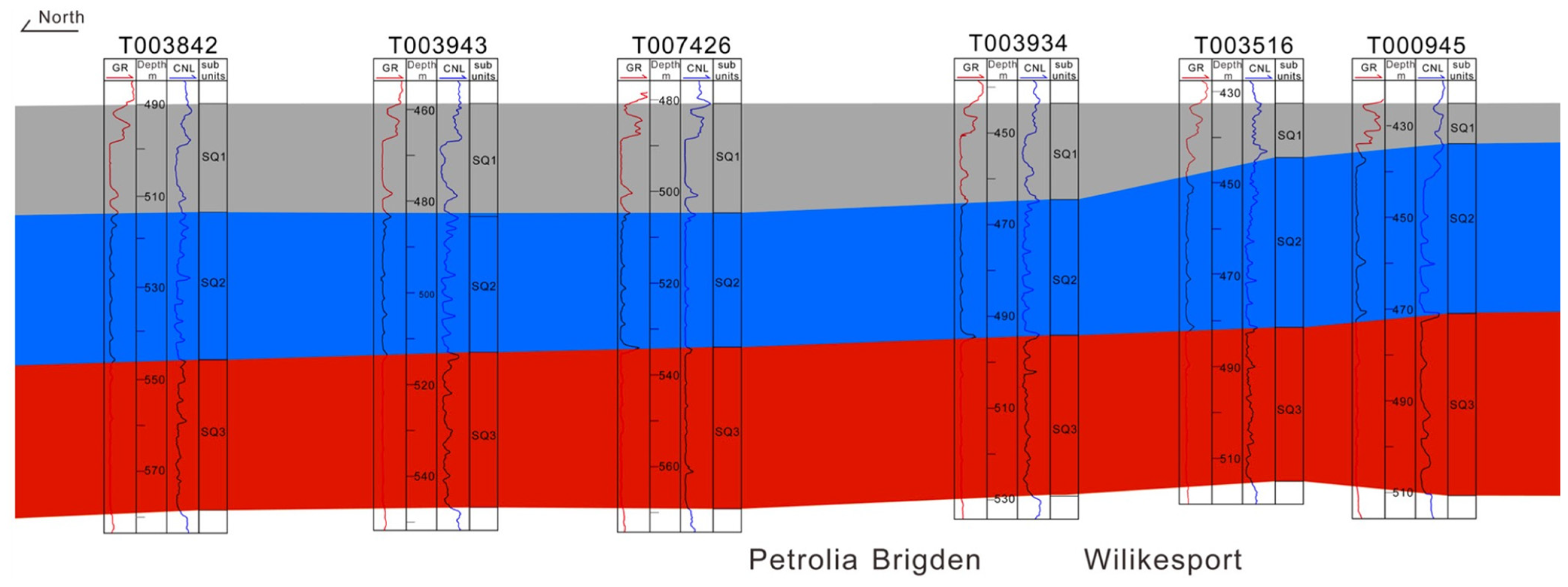 20]. Each subunit is distinguished by a different color. For modeling purposes, average thicknesses of 30 m for SQ2 and 35 m for SQ3 were adopted, reflecting the uniform conditions observed in the Petrolia–Bridge–Wilkesport area.