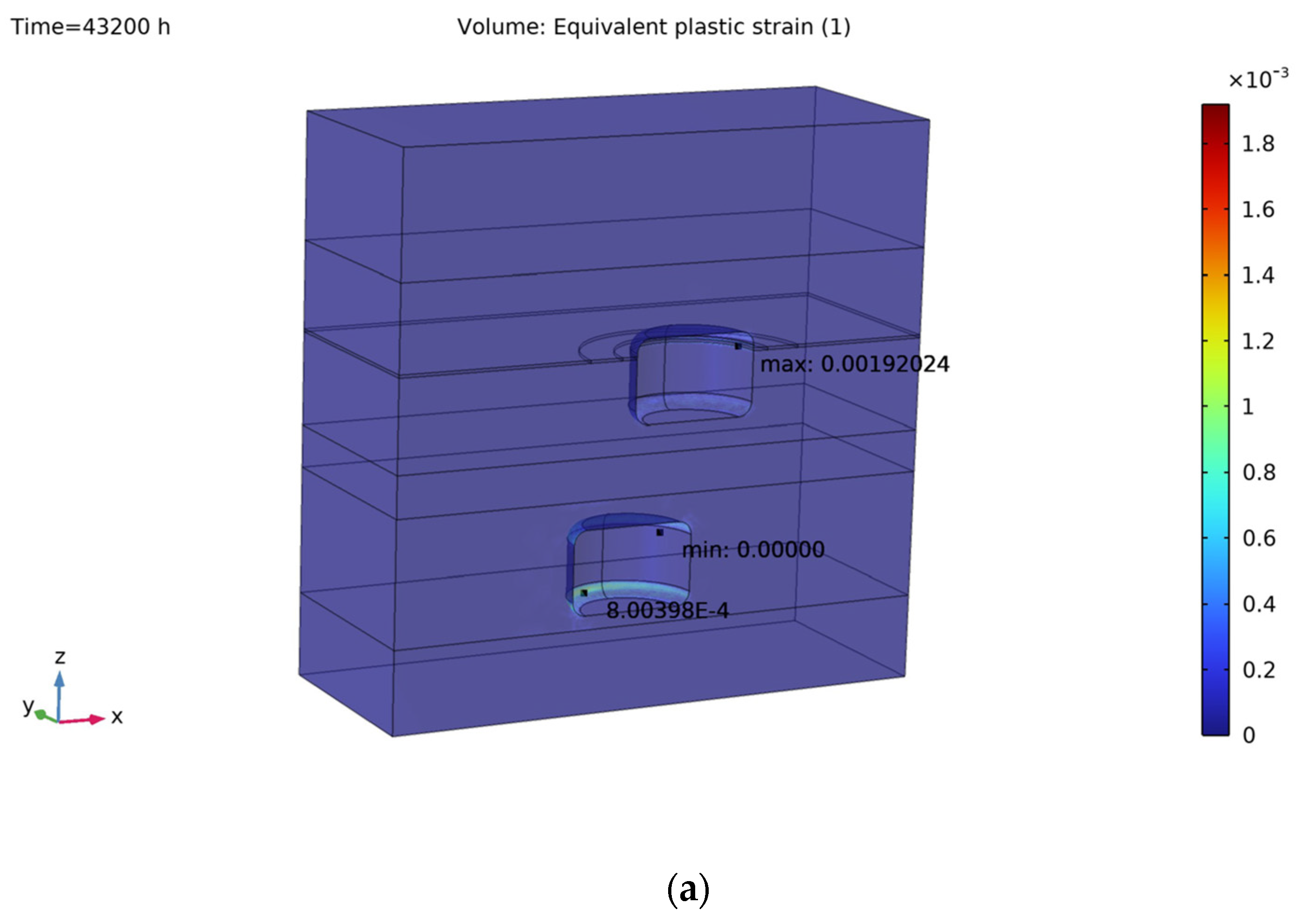 21]. Higher injection temperatures (>25 °C) were not considered because they are uncommon under Canadian surface climate and could unrealistically accelerate halite creep and permeability evolution. Therefore, the chosen range adequately brackets the realistic thermal conditions while capturing their potential influence on cavern deformation and brine leakage, enabling assessment of how modest but sustained temperature differences affect salt creep, deformation, and cavern stability over long-term cyclic operation. The thermal expansion of brine is neglected in this study, as its effect on pressure and leakage is considered negligible compared with the dominant creep and mechanical responses of the surrounding salt rock. The detailed thermal properties of the rock mass and brine are listed in