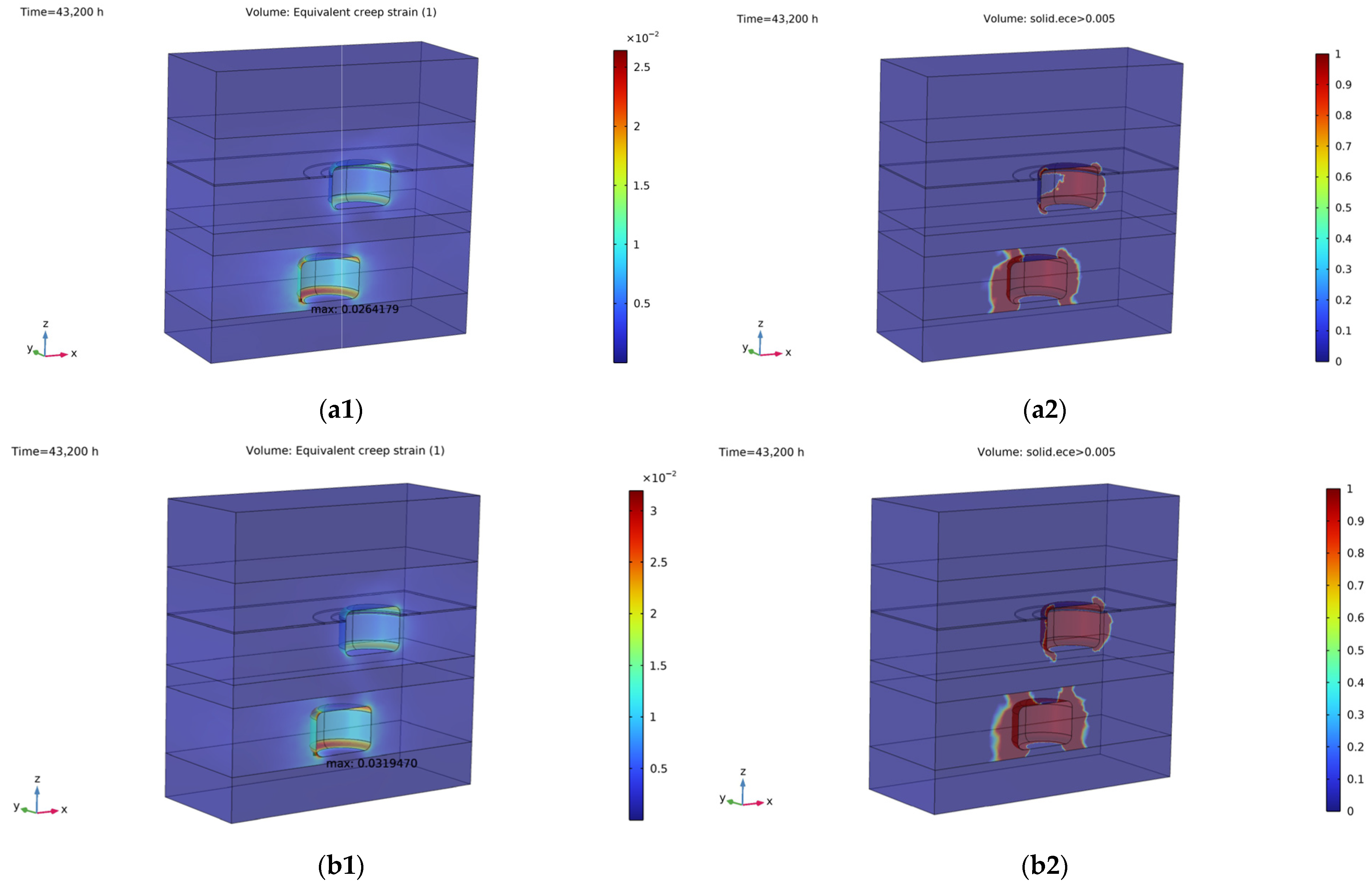 17]. However, adjustments were made to account for the limited thickness of the A2 salt unit. The final cavern height was set to 30 m, with 10 m and 5 m reserved for the hanging wall and roof, respectively.
