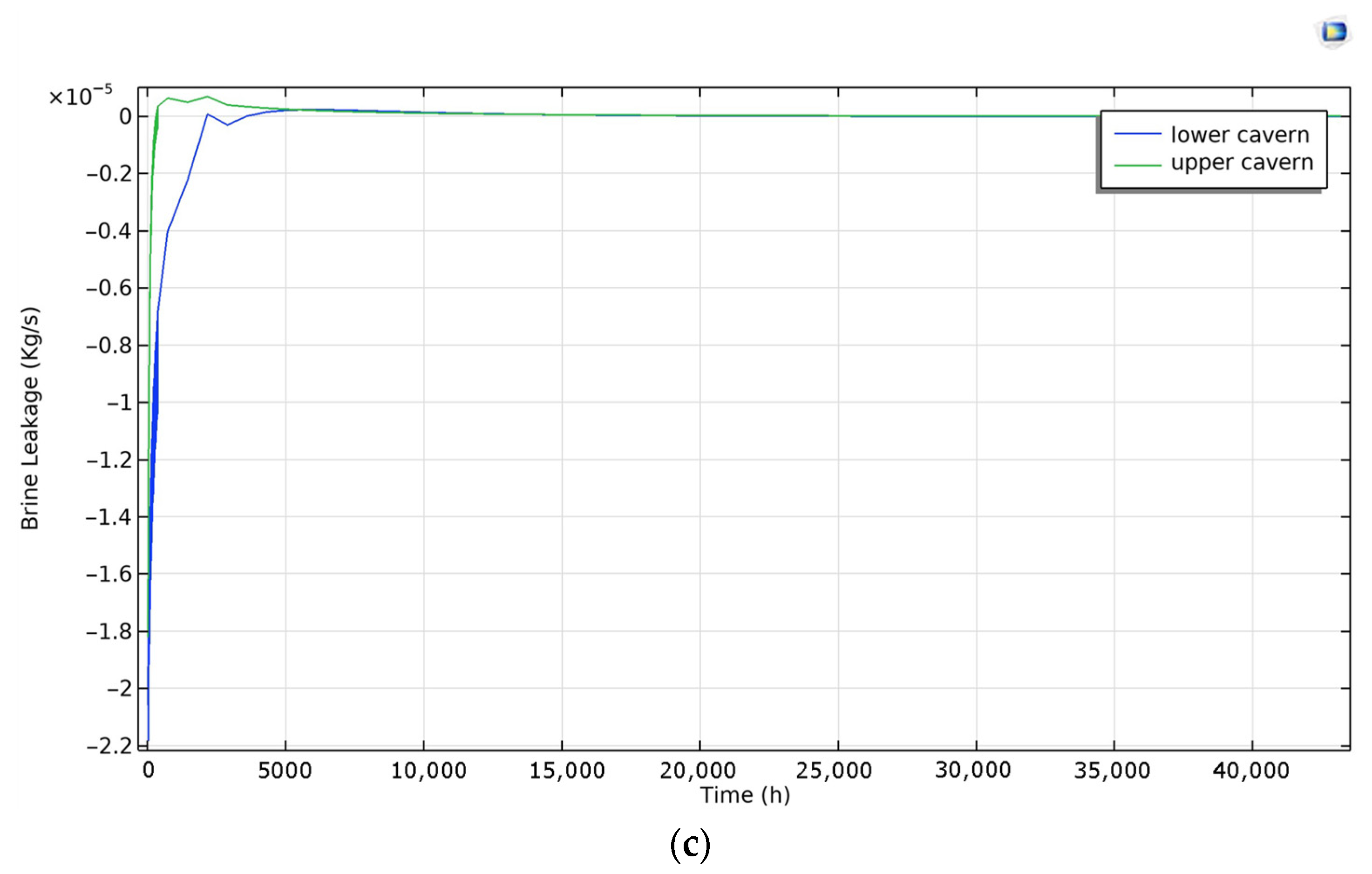 However, it is noteworthy that this approach assumes single-phase Darcy flow and does not account for additional mechanisms such as molecular diffusion, capillary effects, or gas–brine interactions. This simplification is justified because, although cushion gas may leak to a limited extent, its inventory is small and connectivity to the formation is low; consequently, long-term leakage is dominated by liquid flow through the surrounding strata. Moreover, small-scale heterogeneity and permeability anisotropy are not explicitly represented; these could locally enhance or suppress leakage along interbeds or dissolution zones. Nevertheless, given the extremely low permeability of the host salt and interbedded formations, the single-phase Darcy assumption provides a reasonable and conservative estimate of long-term brine migration.