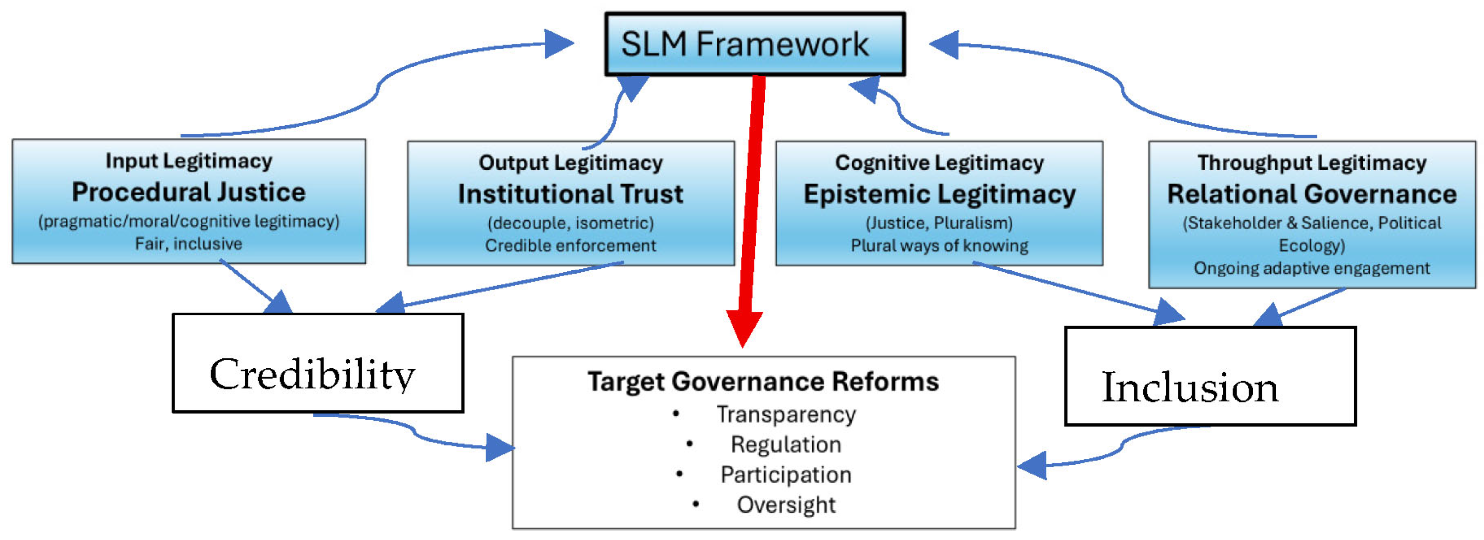 - Frames legitimacy as ongoing and interactive, shaped through four dimensions: procedural justice, institutional trust, epistemic legitimacy, and relational governance.