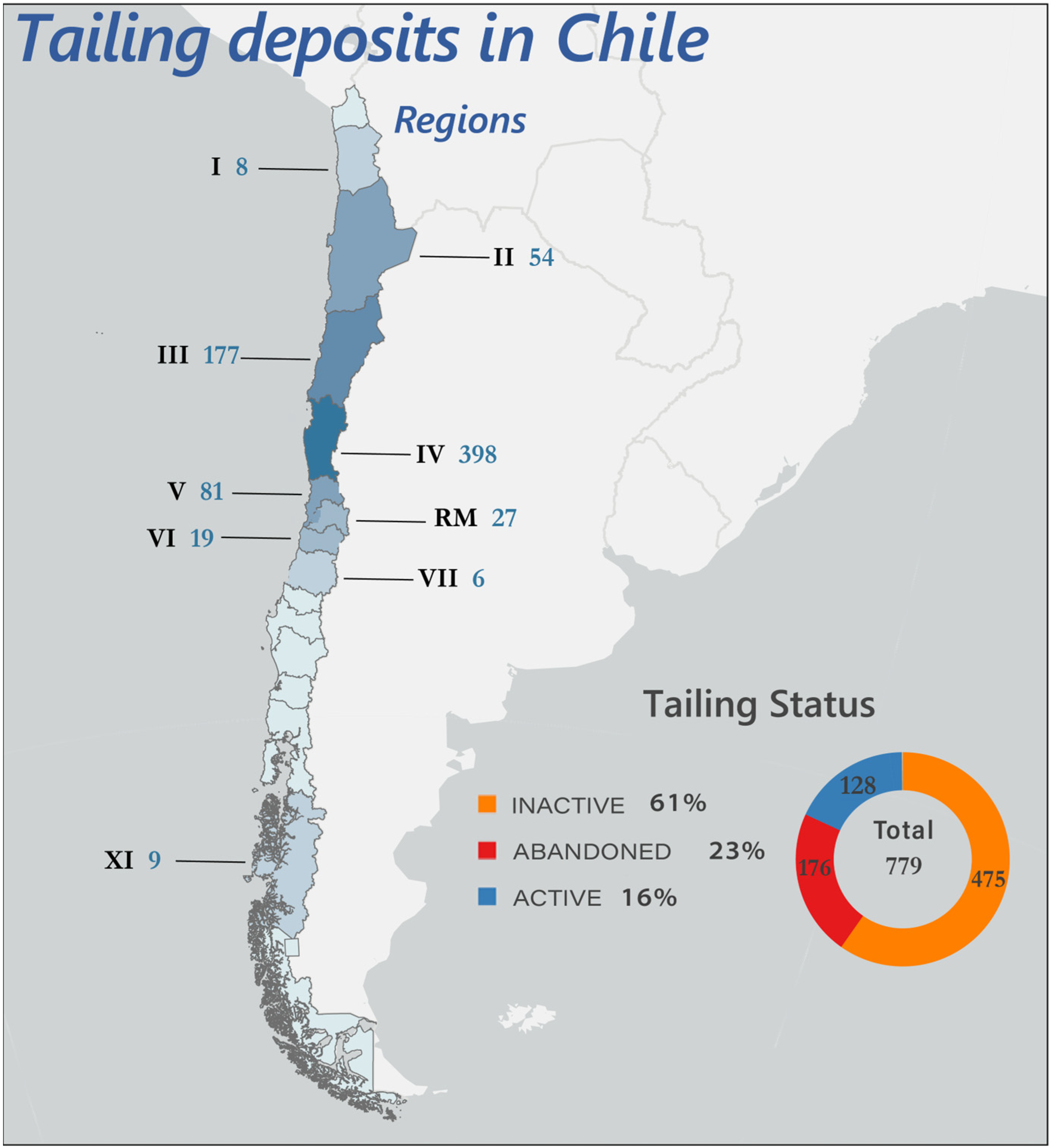 - Yurisch, T. Situación de los Pasivos Ambientales Mineros en Chile: El Caso de los Depósitos Mineros en Chile; Fundación Terram: Santiago, Chile, 2016; Available online: https://www.terram.cl/wp-content/uploads/2018/04/Situación-de-los-Pasivos-Ambientales-Mineros-en-Chile.pdf (accessed on 20 March 2025).