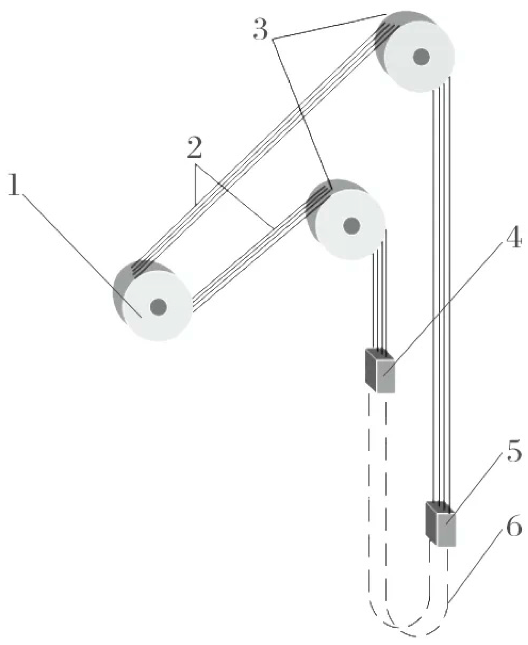 Figure 1 shows the design of a mine hoisting installation, including a friction pulley 1, hoisting ropes 2, steering pulleys 3, cargo vessels 4–5, and tail rope 6.