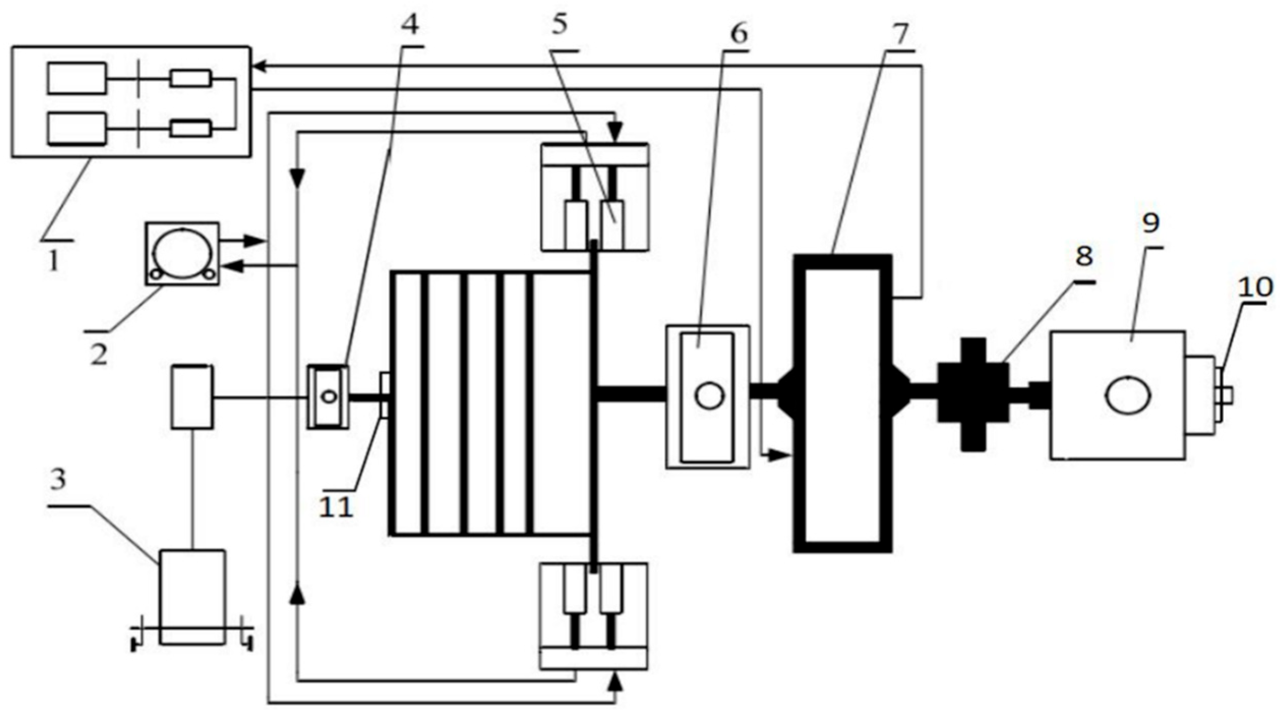 Figure 2) comprises a lubrication pump (1), a hydraulic station (2), a depth indicator (3), a spindle unit (4), a disk brake (5), a main bearing (6), a gearbox (7), an electric motor (9), and angle sensors (10 and 11).